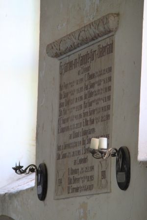 Der hölzerne Kanzelkorb und die Gedenktafeln für die Kriegsgefallenen