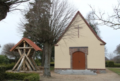 Die zur Kapelle ausgebaute Trauerhalle mit Glockenstuhl