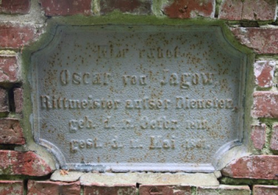 Ansicht von Norden mit Patronatszugang und Eingang zur Familiengrabstätte Im Osten schließt sich eine große Grabanlage der Familien v. Podbielski und v. Jagow an. Theophil von Podbielski heiratete Agnes von Jagow (1823-1887), deren Familie zu der Zeit im Besitz von Gut Dallmin war. Diese ließ um 1800 das noble Gutshaus errichten. Der Familie v. Jagow sind mehrere Tafeln gewidmet. |