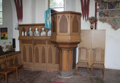 Die schlichte neugotische Kanzel mit Predigerverschlag