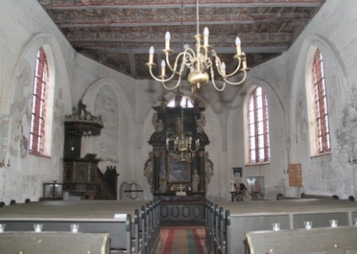 Innenansicht Mit der Erweiterung der Kirche nach Westen im Rahmen des Turmabrisses Ende des 18. Jahrhunderts wird die Kirche auch mit einer barocken Deckenmalerei ausgestattet. Die flache Holzbalkendecke erhält eine üppige Akanthusranken-Bemalung. Die Farben blau und gelb sowie das Wappen mit den drei Kronen (Tre Kronor) und den Initialen FR (Fridericus Rex) verweisen auf den schwedischen König Friedrich I. (1720-1751). Bauarbeiten an der Kirche sind für 1726 und 1748 überliefert. Der Altar wurde im Jahr 1741 gestiftet, die Kanzel stammt aus der Zeit um 1680 und der Pultengel um 1700. Die letzte große Renovierung der Kirche fand 1934 unter Leitung des Architekten Bernhard Hopp statt, von ihm erhält die Kirche auch die neue figürliche Ausmalung. Auf einer Fläche der Nordwand wurden seinerzeit feingliedrige Rankenmalereien aus der Bauzeit der Kirche freigelegt. In der Kirche werden auch mehrere Votivschiffe gezeigt, die die Bedeutung der Kirche für Fischer und Seefahrer unterstreichen. |