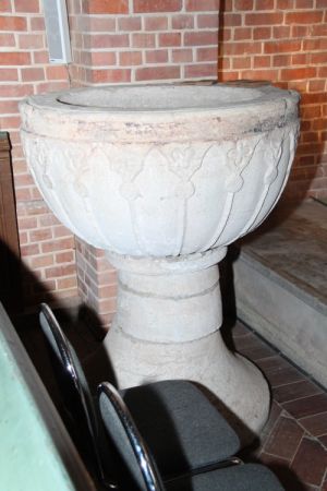 In der Kirche stehen zwei Taufsteine