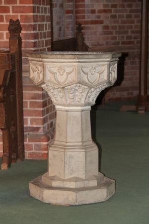 In der Kirche stehen zwei Taufsteine