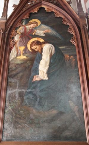 Der neugotische Altaraufsatz steht an der Südwand des Kirchenschiffs