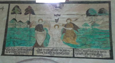 Die Wandmalereien aus den verschiedenen Epochen: Südwand Das epitaphähnliche Bild von der Auferstehung Christi und die Darstellung der Taufe Jesu im Jordan an der Südwand des Kirchenschiffes stammen von 1584. Im Apostelfries sind darüber noch Johannes, Jakobus d.Ä. und Petrus dargestellt. Im Osten sind links bzw. rechts vom Triumphbogen noch Christus als Salvator mundi und Moses mit den Gesetzestafeln dargestellt. |