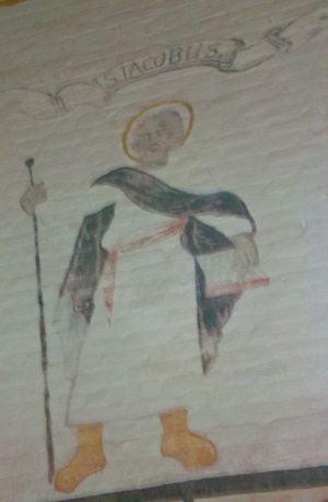 Die Wandmalereien aus den verschiedenen Epochen: Südwand Das epitaphähnliche Bild von der Auferstehung Christi und die Darstellung der Taufe Jesu im Jordan an der Südwand des Kirchenschiffes stammen von 1584. Im Apostelfries sind darüber noch Johannes, Jakobus d.Ä. und Petrus dargestellt. Im Osten sind links bzw. rechts vom Triumphbogen noch Christus als Salvator mundi und Moses mit den Gesetzestafeln dargestellt. |