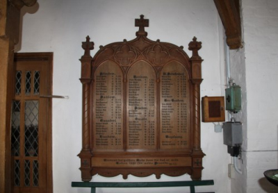 Im Turmraum hängen die Gedenktafeln für die in den zahlreichen Kriegen gefallenen Gemeindemitglieder