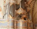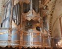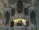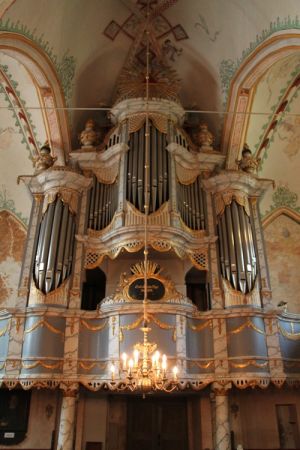 Die barocke Orgel Wie ein räumlicher Gegenpol wirkt der spätbarocke Orgelprospekt. Er zeigt bereits klassizistische Tendenzen und ist 1780 entstanden. 1870 erfolgte der Einbau einer Winzer-Orgel. Das zweimanualige Instrument mit mechanischen Schleifladen besitzt 14 Register mit Pedal und wurde von Schuke 1973 erneuert. |