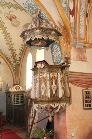 Die barocke Kanzel Die nur geringfügig ältere Kanzel (1751/52) zeigt reiche vegatabile Akanthusschnitzereien, freiplastische Voluten und am Schalldeckel Cherubköpfe und eine Taube; die Bekrönung mit Pelikan-Motiv. Die Besonderheit stellt eine vierteilige Kanzeluhr dar. |