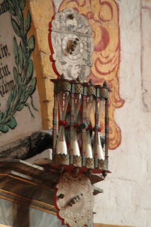 Die barocke Kanzel Die nur geringfügig ältere Kanzel (1751/52) zeigt reiche vegatabile Akanthusschnitzereien, freiplastische Voluten und am Schalldeckel Cherubköpfe und eine Taube; die Bekrönung mit Pelikan-Motiv. Die Besonderheit stellt eine vierteilige Kanzeluhr dar. |