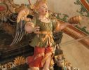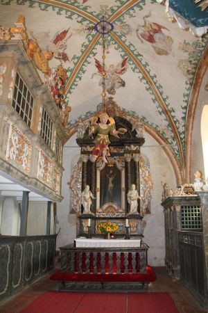 Der Altarraum mit Altaraufsatz, Taufengel und Patronatsempore Im Zentrum steht der barocke Altaraufsatz von 1754/55, davor hängt der Taufengel aus der gleichen Zeit. Die Kanzel am südlichen Triumphbogen ist nur ein wenig älter, 1751/52. An der Nordwand steht die Wustrowsche Patronatsempore (M.18.Jh.) mit einer Bekrönung durch Wappenkartusche mit goldenen Löwen. An der Südwand steht das barocke Beichtgestühl. |