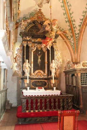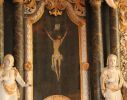 davor zwei vollplastische allegorische Figuren, sie rahmen ein gemaltes Kruzifix, Akanthusschnitzerei,