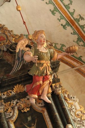 Im Zentrum steht der barocke Altaraufsatz von 1754/55, davor hängt der Taufengel aus der gleichen Zeit. Die Kanzel am südlichen Triumphbogen ist nur ein wenig älter, 1751/52.