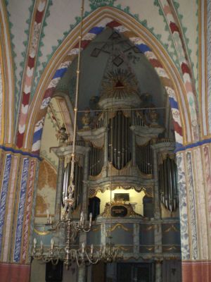 Die barocke Orgel Wie ein räumlicher Gegenpol wirkt der spätbarocke Orgelprospekt. Er zeigt bereits klassizistische Tendenzen und ist 1780 entstanden. 1870 erfolgte der Einbau einer Winzer-Orgel. Das zweimanualige Instrument mit mechanischen Schleifladen besitzt 14 Register mit Pedal und wurde von Schuke 1973 erneuert. |