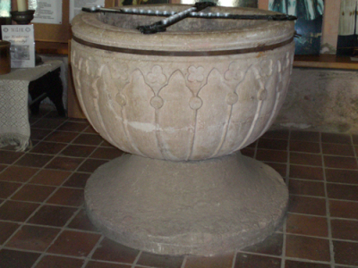 Die Tauffünte aus Gotländischem Kalkstein und das Triumphkreuz aus dem 14. Jahrhundert Das Triumphkreuz aus dem 14. Jahrhundert zeigt die für diese Entstehungszeit typischen Evangelistenmedaillons. Die zur Kreuzgruppe gehörenden Assistenzfiguren der Maria und des Johannes sind verlorengegangen. Das älteste Ausstattungsstück ist die Tauffünte aus Gotländischem Kalkstein aus der Mitte des 13. Jahrhunderts. |