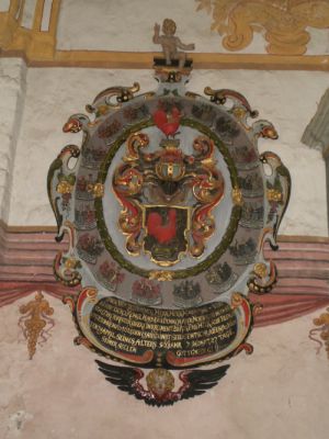 Epitaph von Bibow Der prunkvolle Wappenepitaph zeigt im Hauptwappen den roten Hahn, das Wappentier der mecklenburgischen Adelsfamilie von Bibow, die wohl eines Stammes mit denen von Hahn sind. In Mecklenburg besaß die Familie im 18. Jahrhundert umfangreichen Güterbesitz, u.a. in Alt Karin, Ventschow, Westenbrügge, Passee sowie in Marihn und Mollenstorf, dazu in Pommern auch Langenhanshagen. In Preußen war das Geschlecht auch ansässig, ein späterer Vertreter war Erich von Bibow (1873-1937), der 1919 Mitbegründer der revanchistischen Freikorps Lützow war. |