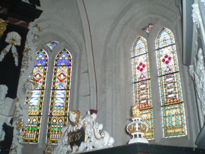 Die Inschriften in den äußeren südlich gerichteten Chorfenstern lauten: Im Ostfenster, welches vom Kanzelaltar verdeckt wird, sind in den Spitzen Wappenscheiben (oben Doppelwappen, untere Spitzen v. Bibow) angebracht. Die Buntglasfenster stammen aus dem Jahr 1875. |