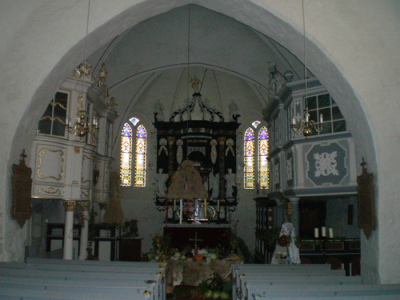 Innenansicht Der Innenraum wirkt durch die einheitliche barocke Ausstattung sehr geschlossen. Blickfang sind der Kanzelaltar, der 1736 von dem Bildhauer H.J. Bülle geschaffen wurde, und die beidseitig im Chor angeordneten Patronatslogen. In den fünf Fenstern im Chor sind prächtige Buntglasscheiben eingesetzt. An der südlichen Chorseite steht ein (evangelischer!) Beichtstuhl aus dem Jahr 1755. |