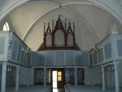 Orgel Die dreiseitige Empore aus dem späten 18. Jahrhundert trägt an der Westwand die Orgel aus dem Jahr 1904 mit einem neugotischen Prospekt. Die Orgel wurde von Marcus Runge, dem Sohn von Johann Heinrich Runge, gebaut. Geboren 1865 in Hagenow, lernt er bei seinem Vater und arbeitet anschließend bei bedeutenden Orgelbaumeistern seiner Zeit, u.a. LADEGAST, SAUER und nicht zuletzt Friedrich Friese (FRIESE III), von dem er nach dessen Tod 1896 die Werkstatt in Schwerin kauft und unter der Bezeichnung - M. Runge, Hoforgelbauer, Frieses Nachf. - fortführt. 1912 wird RUNGE zum Hoforgelbauer ernannt. Er stirbt 1945 in Schwerin. Mit dem Wirkungsende von RUNGE 1945 erlischt die einheimische mecklenburgische Orgelbauertradition. Die Orgel in Alt Karin besitzt zwei Manuale und zehn Register. |