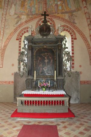 Das Altarbild eines unbekannten Meisters zeigt die Kreuzigung Jesu inmitten der mitgekreuzigten Verbrecher. Bemerkenswert ist die Darstellung der Maria Magdalena am Fuße des Kreuzes und die Blickrichtung von Jesus.