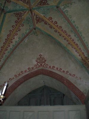 Blick in das Kirchenschiff mit Sterngewölbe, Westempore und Orgel Die 1842 datierte Schleifladen-Orgel mit mechanischer Traktur wurde von C. Noebe unter Einbeziehung einiger Register aus dem Vorgängerinstrument von C. Engelbrecht (1701) gebaut. Vom ursprünglichen Platz am vorderen Emporenrand wurde sie beim letzten Umbau ganz in den Turmbereich verschoben, wodurch von Klang und Wirkung einiges verloren ging. |