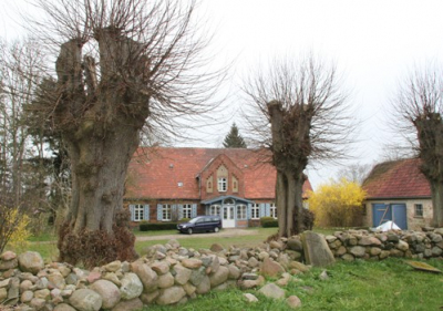 Der Kirchhof ist von einer Feldsteintrockenmauer umgeben, gegenüber liegt der Pfarrhof