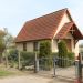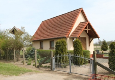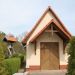 Friedhof mit moderner Trauerhalle und kleinem hölzernen Glockenstuhl mit Stahlglocke von 1962.