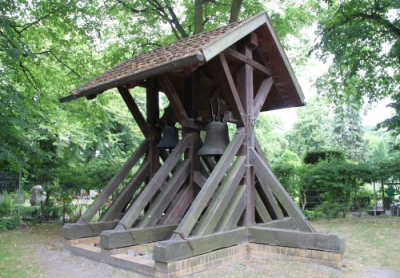 Der freistehende Glockenstuhl mit zwei Bronzeglocken