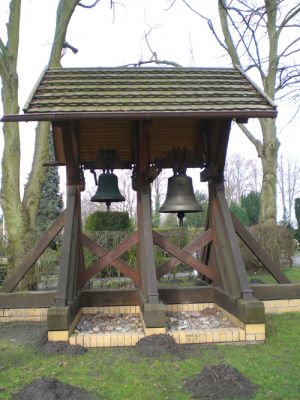 Der freistehende Glockenstuhl mit zwei Bronzeglocken
