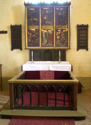 Altar Gotische Flügelaltäre hatten oftmals die Fähigkeit, je nach Anlass im Kirchenjahr, ihre Gestalt zu wandeln bzw. ihre Flügel zu verschließen. In der Fastenzeit wurden die meistens mit geschnitzten Heiligenfiguren besetzten Flügel eingeklappt und mit gemalten Bildern aus der Passion Christi verschlossen. Der Altaraufsatz in der Kirche in Dahmen könnte aus solchen Verschlussbildern zusammengesetzt sein. Auf drei Tafeln mit je zwei Bildern sind Szenen aus der Leidensgeschichte Jesu dargestellt, angefangen mit der Todesangst im Garten Gethsemane und den schlafenden Jüngern, bis hin zur Abnahme des Leichnams Jesu vom Kreuz. Umgeben ist der Altar mit einem Gehege aus neugotischen Arkadenbögen mit einer Pilasterbrüstung. |