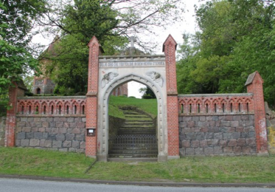 Das Friedhofsportal gibt Zutritt zum Friedhof - allgegenwärtig die Familie von Maltzahn