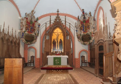 Der neugotische Altar mit den seitlich angebrachten Epitaphien