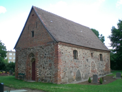 Außenansicht - Ostseite Der turmlose Feldsteinbau mit Backsteineinschlüssen, wohl 16. Jahrhundert, hat auf der Ostseite einen jüngeren Fachwerkgiebel. Die kleinen segmentbogigen Fenster sind wohl auch nachträglich verändert worden. An der Ostwand steht ein hölzerner Glockestuhl mit einer Glocke die 1697 von Ernst Siebenbaum, Rostock gegossen wurde. Der Westgiebel ist aus Backstein, bzw. mit Backstein nachträglich verblendet worden. |
