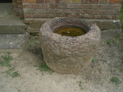 Westturm Der schlanke quadratische Westturm mit dem achtseitigen Spitzhelm ist eine Zutat aus dem 19. Jahrhundert. Die neoromanischen Stilelemente des Ziegelbaus passen nicht wirklich zum barocken Kirchenschiff, aus dem Grund wurde wohl auch die Form der übergiebelten rundbogigen Fenster und Schallöffnungen auf das Kirchenschiff übertragen. Rechts und links vom Eingang des Turmportals stehen alte Weihwasserbecken oder auch Taufbecken aus rotem Granit bzw. Sandstein. An der Seite des Friedhofs steht eine moderne Leichenhalle mit einer Inschrift. |