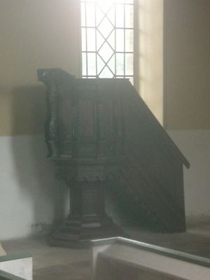 Ausstattung Der Innenraum ist mit einer flachen Balkendecke überzogen. Die Ausstattung besteht im Wesentlichen aus dem hölzernen Altartisch mit dem Gehege aus durchbrochenem vegetabilen Schnitzwerk und dem Altarbild an der Wand mit einer Darstellung des Heilenden Christus sowie der hölzernen Kanzel mit Aufgang, alles wohl aus dem Ende des 19. Jahrhunderts. Für die Gemeinde ist ein einfaches Bankgestühl vorgesehen. Die Westempore ist erneuert und der Raum darunter mit einer Glaswand abgetrennt, dahinter befindet sich die Winterkirche. |