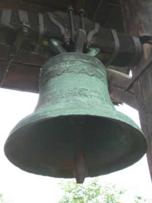 Der freistehende Glockenstuhl mit einer Glocke von 1747 Der am Westgiebel stehende Glockenstuhl wurde 1987 errichtet und 1997 repariert.Der hier im Bild gezeigte neue Glockenstuhl wurde am 8. November 2021 eingeweiht.Die Bronzeglocke trägt eine Inschrift "Soli Deo gloria, anno 1747" und zeigt das mecklenburgische Wappen.Offensichtlich stammt die Glocke bereits aus der 1703 errichteten Vorgängerkirche.Auch sind die Namen von Persönlichkeiten aus der Zeit auf der Glocke genannt.Die Glocke wird täglich um 18:00 Uhr geläutet.  |