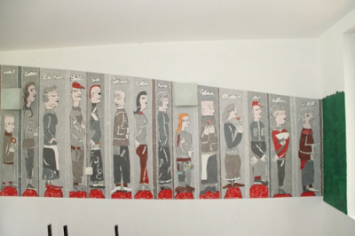Das sechste Werk an durch Künstler Otto Sander Tischbein ausgemalten Trauerhallen  Als ich den Künstler bei seiner Arbeit am 4. August 2025 besuchte, war das Kunstwerk leider noch nicht ganz fertiggestellt.Im Mittelteil fehlt noch der in der Skizze vom 19. Juli gezeigte, die Insel im Useriner See überspannende, Regenbogen und der blaue Himmel.Das für den Künstler so typische Motiv der "grauen" einziehenden und farbenfrohen ausziehenden Trauernden ist wiedereinmal detailliert und meisterhaft dargestellt.  |