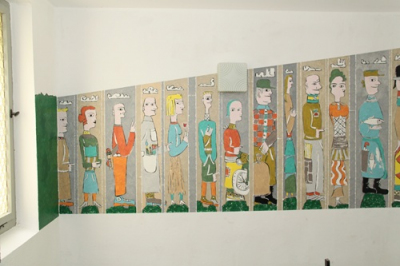 Als ich den Künstler bei seiner Arbeit am 4. August 2025 besuchte, war das Kunstwerk leider noch nicht ganz fertiggestellt.Im Mittelteil fehlt noch der in der Skizze vom 19. Juli gezeigte, die Insel im Useriner See überspannende, Regenbogen und der blaue Himmel.Das für den Künstler so typische Motiv der "grauen" einziehenden und farbenfrohen ausziehenden Trauernden ist wiedereinmal detailliert und meisterhaft dargestellt.