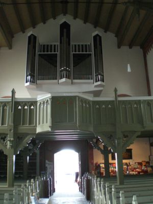 Die große Orgel 1975 erhielt die Kirche die große Orgel. Sie wurde von der Firma Voigt aus Bad Liebenwerda gebaut. Der moderne Prospekt mit der kristallinen Form des Orgelgehäuses wurde in den neugotischen Kirchenraum eingepasst. Die Orgel besitzt 1.587 Pfeifen und 22 Register, die auf zwei Manuale und Pedal verteilt sind. Bei der Generalüberholung 1995 wurde die vorhandene pneumatische Registersteuerung umgerüstet. Jetzt besitzt die Orgel einen an die mechanische Registertraktur angeschlossenen elektronischen Setzer mit 512 Kombinationen. Die Tremulanten sind elektronisch gesteuert und in ihrer Frequenz vom Spieltisch aus regelbar. Unter der Westempore sind weitere aus der alten Kirche stammende Gegenstände angebracht. Es handelt sich um alte Gestühlswangen, so genannte Hausmarken. Jedermann hatte in der Kirche seinen festen Platz, denn mit den Hausmarken haben die Fischer und Schiffer ihre Besitzverhältnisse unmissverständlich dokumentiert. |