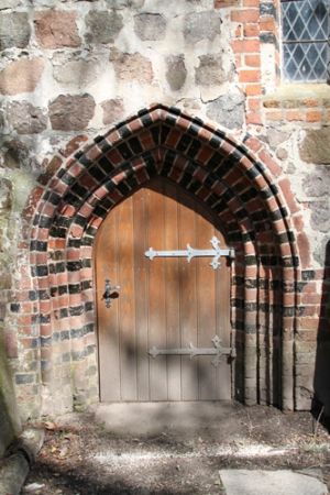 Der eingezogene Feldteinchor Der besondere architektonische Reiz des älteren Rechteckchors aus sauber geschichteten Feldsteinen liegt in den kräftig profilierten Gewänden der Priesterpforte und der Spitzbogenfenster aus schichtweise wechselnden, glasierten und unglasierten Backsteinen dem auf Dreieckskonsolen ruhenden Rundbogenfries unter der Traufe und dem von zwei Blendenreihen gegliederten Ostgiebel. |