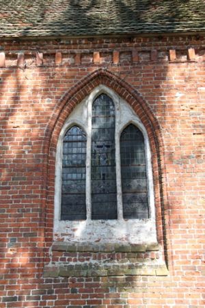 Am Kirchenschiff findet man unter der Traufe einen seltenen Zierfries aus hochgestellten Läufern.