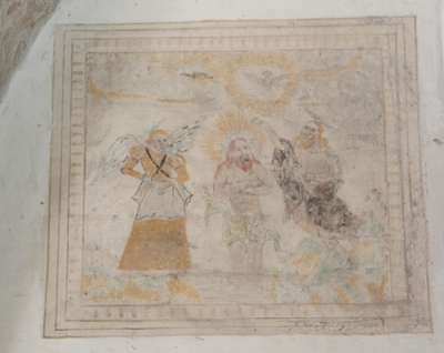 An der Nordwand sind erkennbar: Opferung Isaaks, Taufe Christi und die Kreuzigung.
